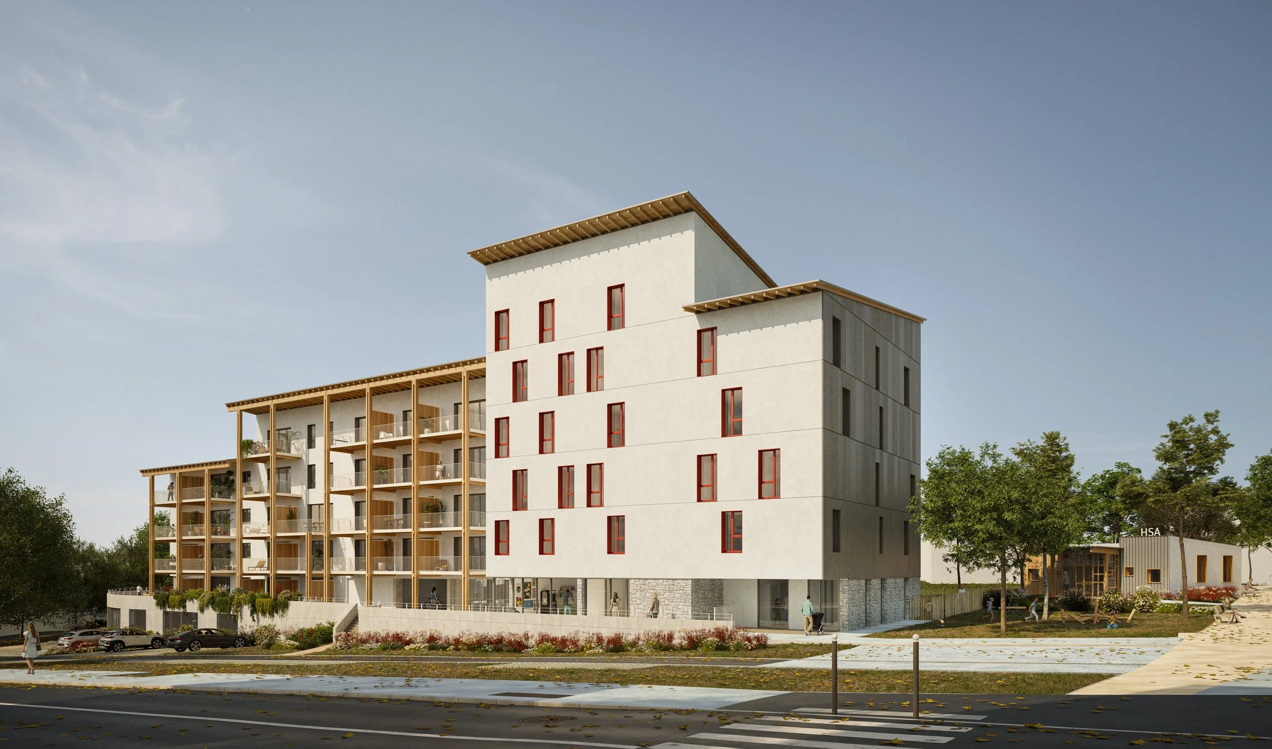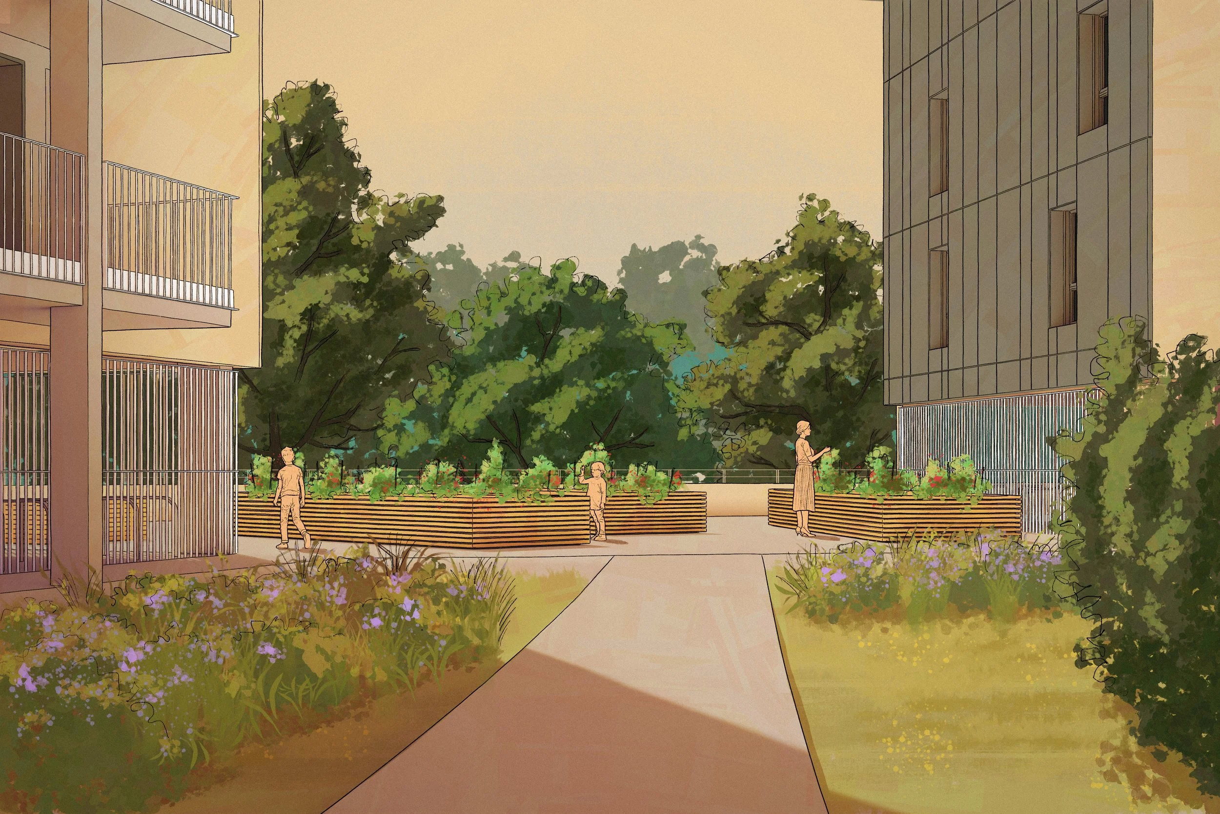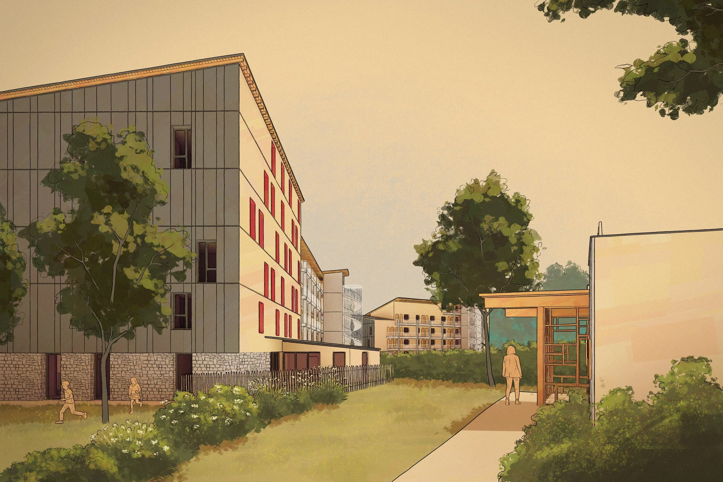 Pour ce projet de logements collectifs à Bayonne, les architectes m’ont confié la réalisation de 4 illustrations digitales dans mon style signature, ainsi que 2 images photoréalistes, afin d’exprimer au mieux l’univers et l’ambiance du futur bâtiment.